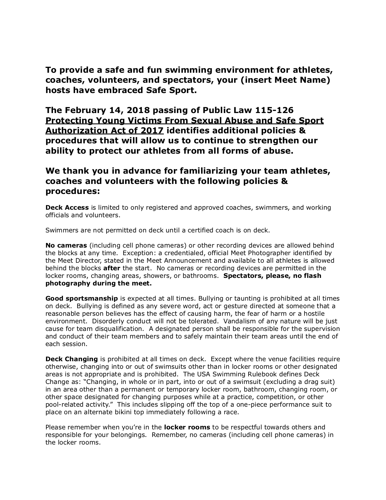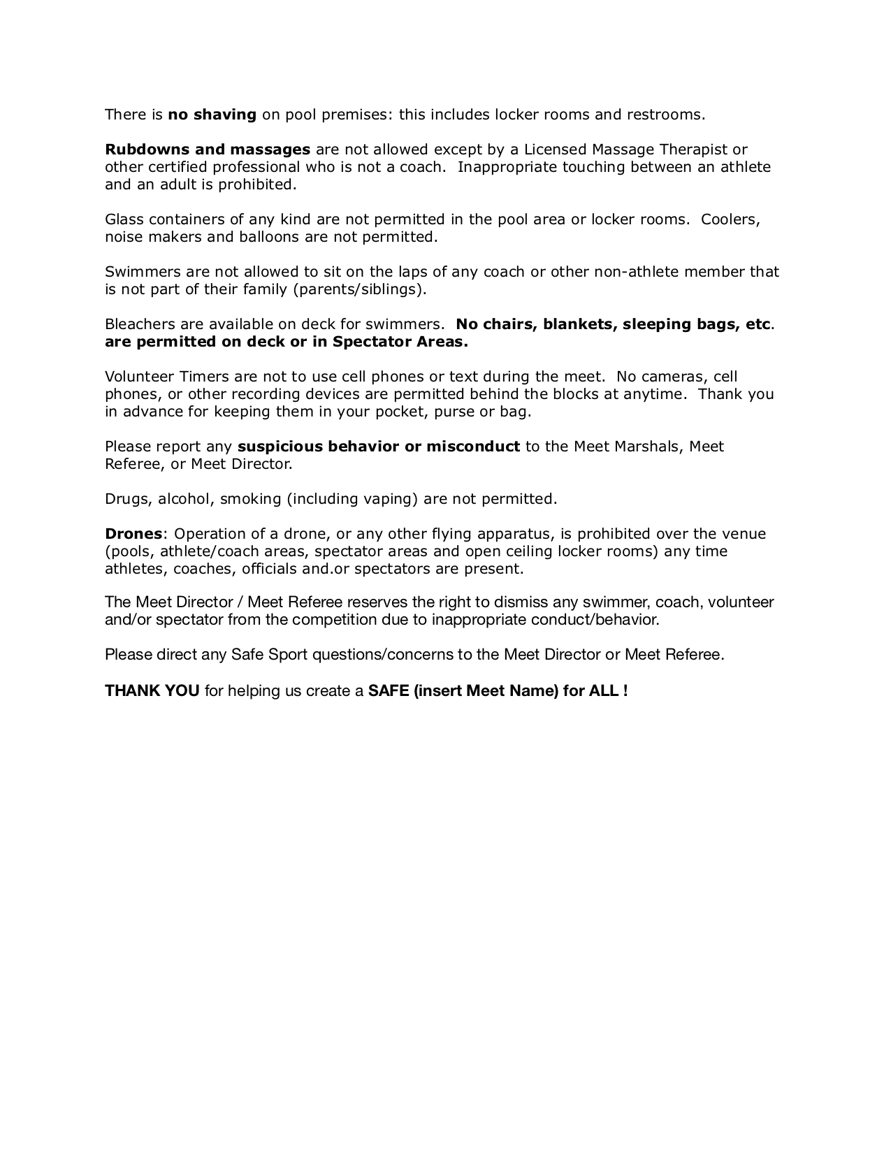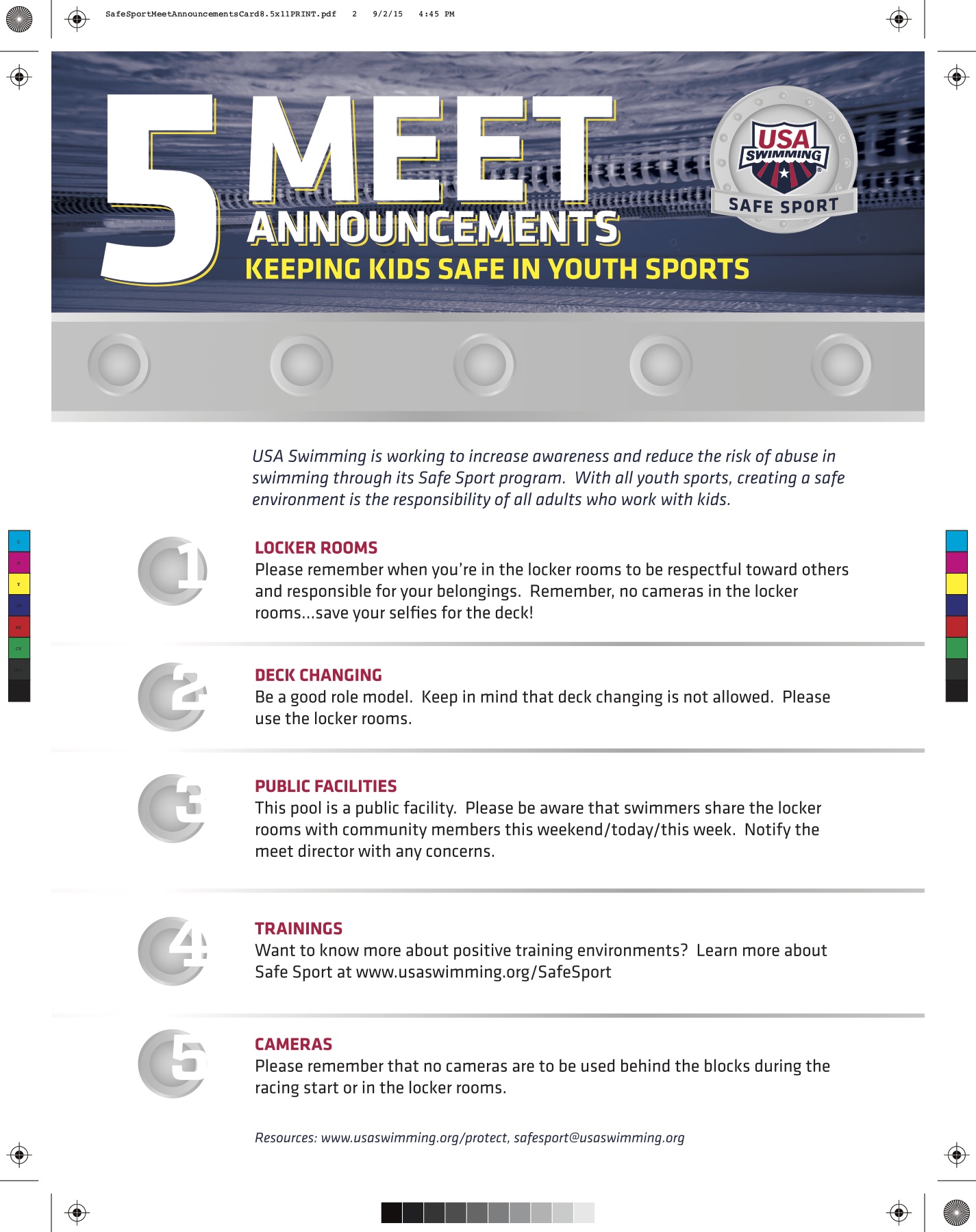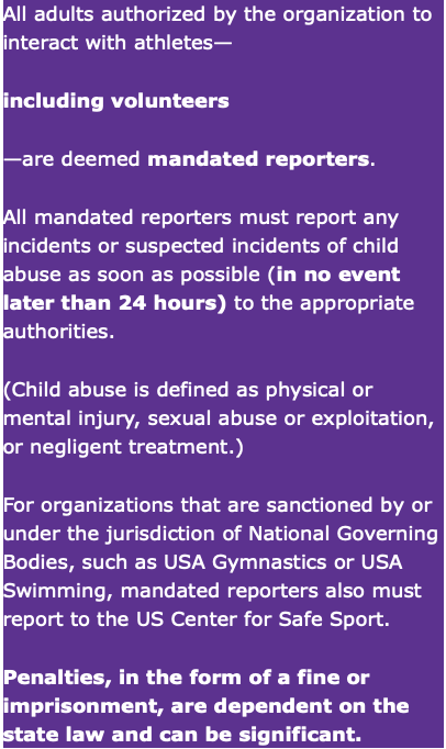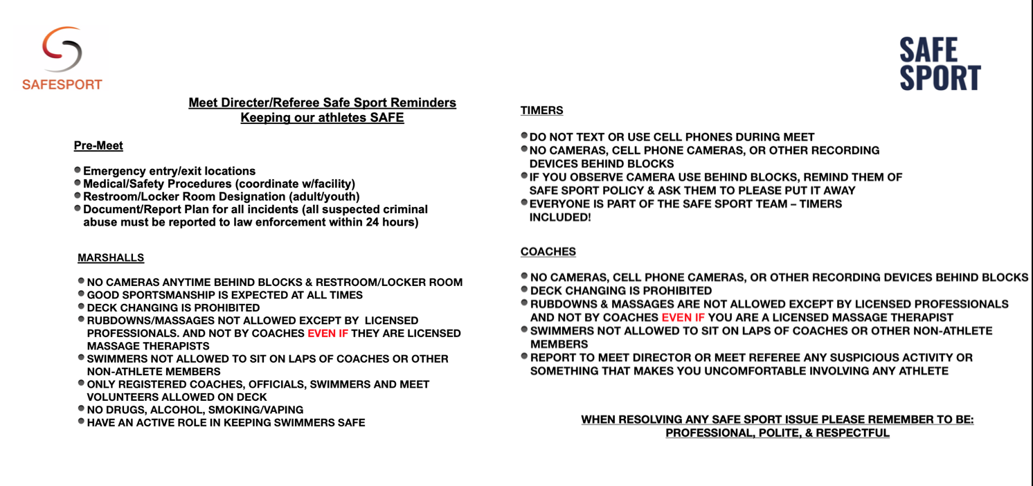 Our Meet Directors and Meet Referees will have some additional Safe Sport responsibilities during our Meets that will include: