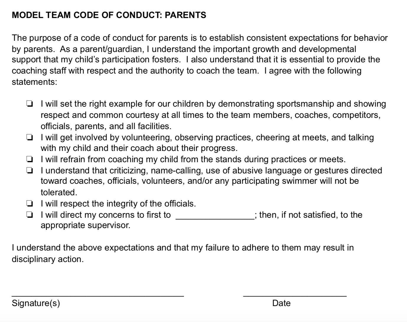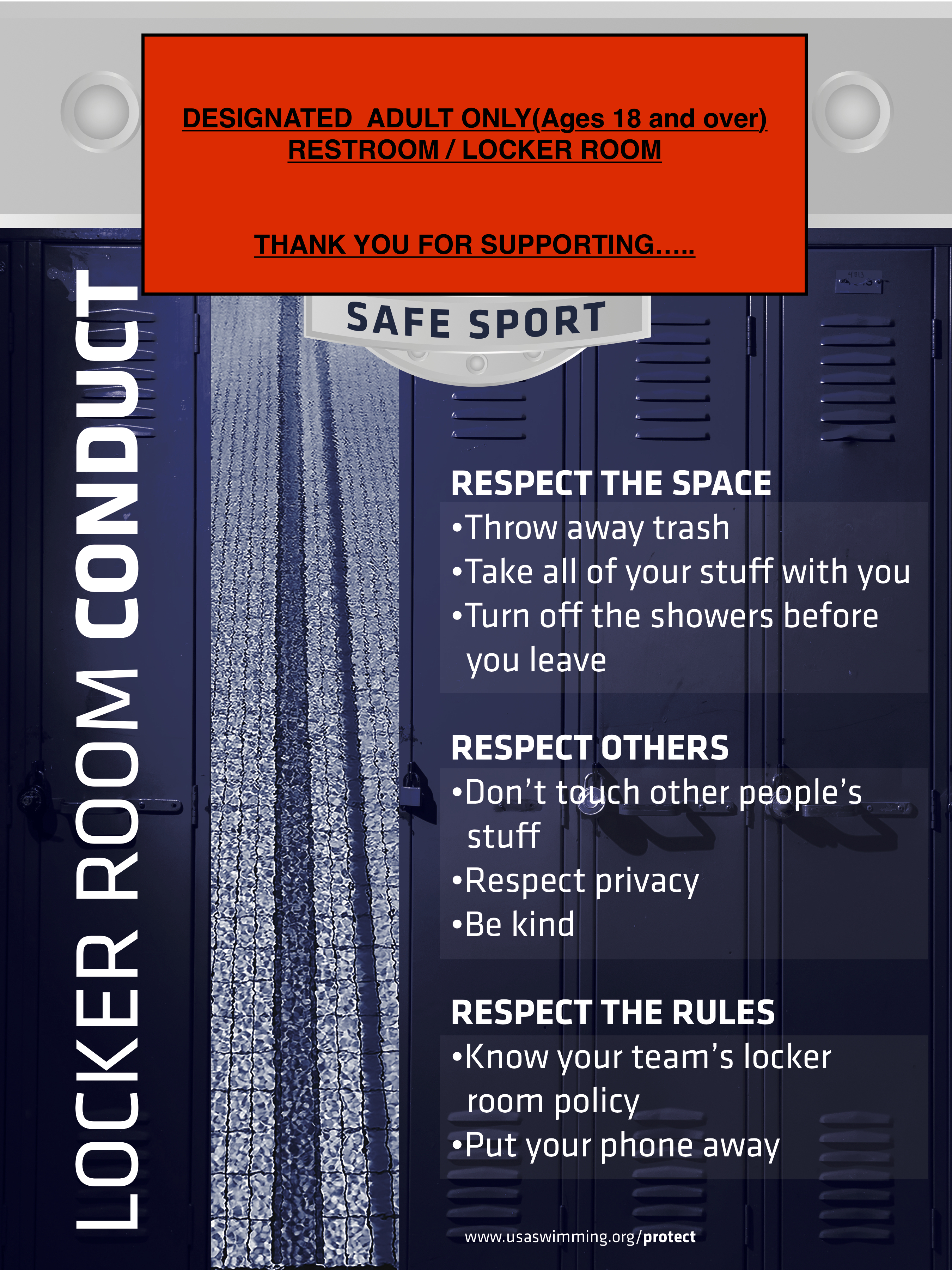 1) All parents are being asked to complete the "Safe Sport for Swim Parents" course through USA Swimming. This course will help you learn all the in and outs of Safe Sport and why it is needed. You can find steps on how to complete with this link. It should not take you long to complete.